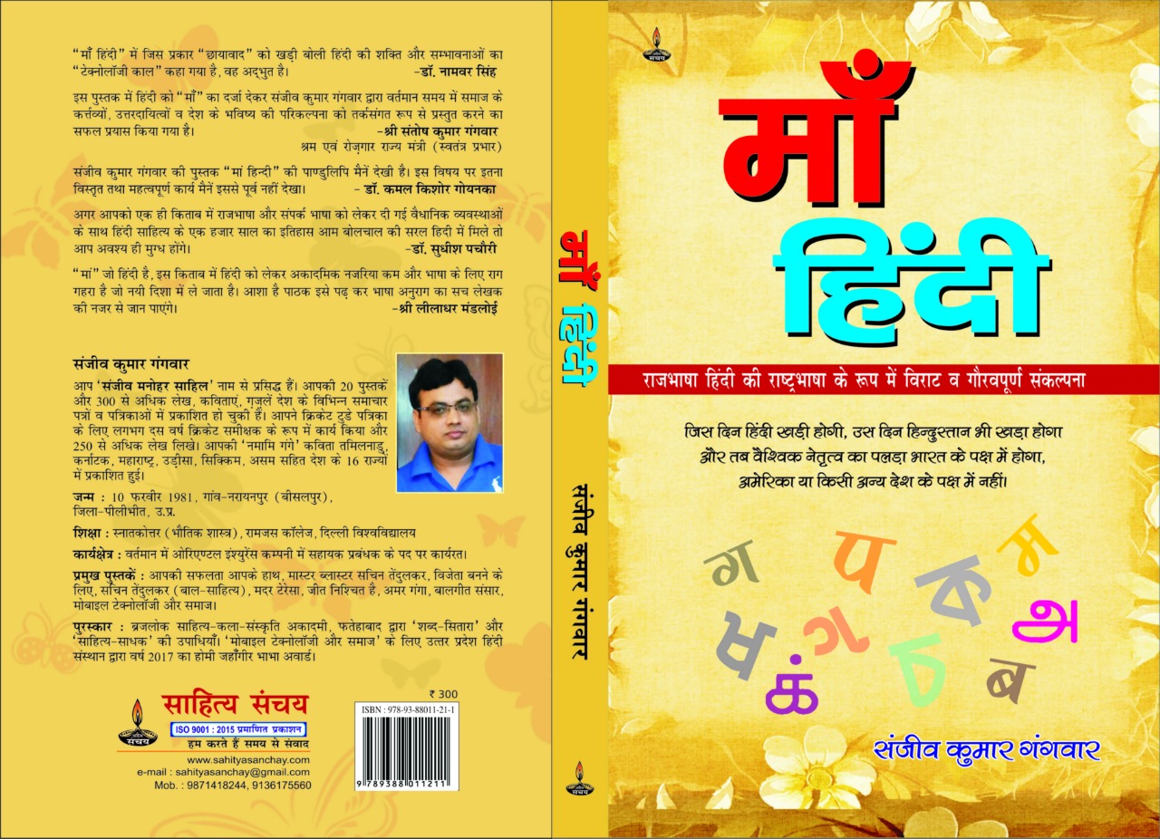 ‘माँ हिंदी’ संजीव कुमार गंगवार जी द्वारा लिखित एक अमर ग्रंथ है | राजभाषा/राष्ट्रभाषा हिंदी को समर्पित यह ग्रंथ हिन्दी साहित्य की जानकारियों को अपने आप में प्रत्येक कालखंड सहित समेटे हुए है, जिससे शोधकर्ताओं को अत्यधिक पसंद आयेगा ग्रंथ – माँ हिंदी | 280 पृष्ठों में लिखित यह दस्तावेज ज्ञान का भंडार है | श्री गंगवार जी ने कठिन परिश्रम से इसका निर्माण किया है | करीब 30 अध्याओं में हिंदी साहित्य की समूची जानकारियों को लिपिबद्ध किया गया है | साहित्य के साथ – साथ संस्कृति, कला, धर्म, समाज जैसे हर प्रमुख विषय पर प्रकाश डाला गया है |