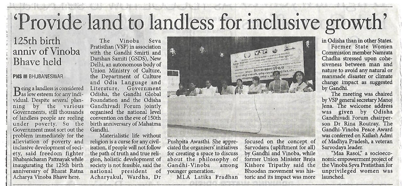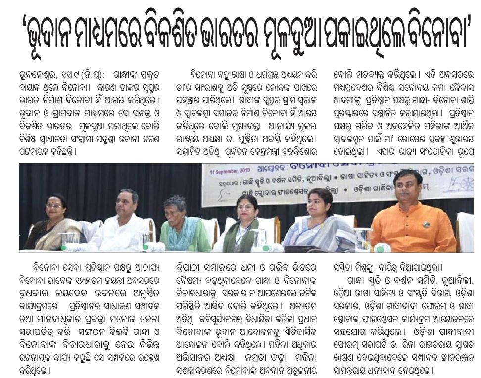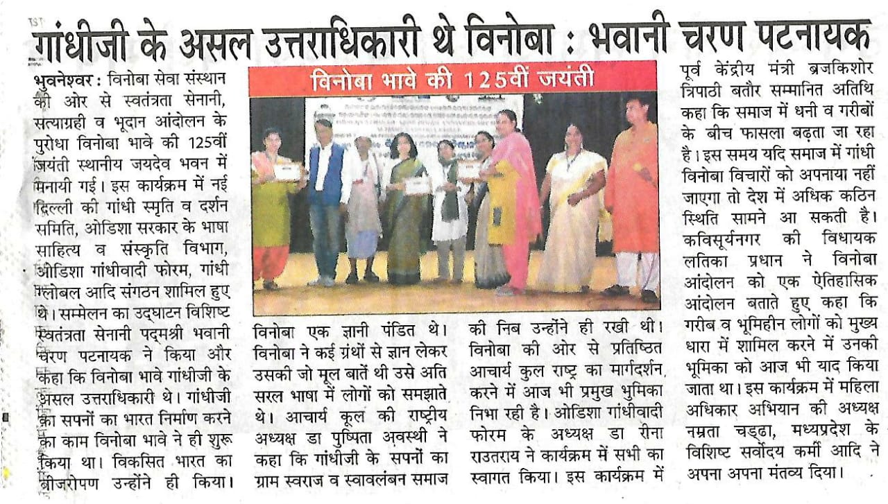 125वीं जयंती के अवसर पर जगन्नाथ की धरती उड़ीसा प्रदेश की राजधानी भुनेश्वर में कार्यक्रम के महासचिव माननीय मनोज जेना जी के नेतृत्व और नीदरलैंड से पधारी विनोबा जी के शिक्षा दर्शन पर केंद्रीत और 1968 में बाबा द्वारा स्थापित आचार्यकुल की राष्ट्रीय अध्यक्षा प्रो.पुष्पिता अवस्थी के मुख्यातिथ्य